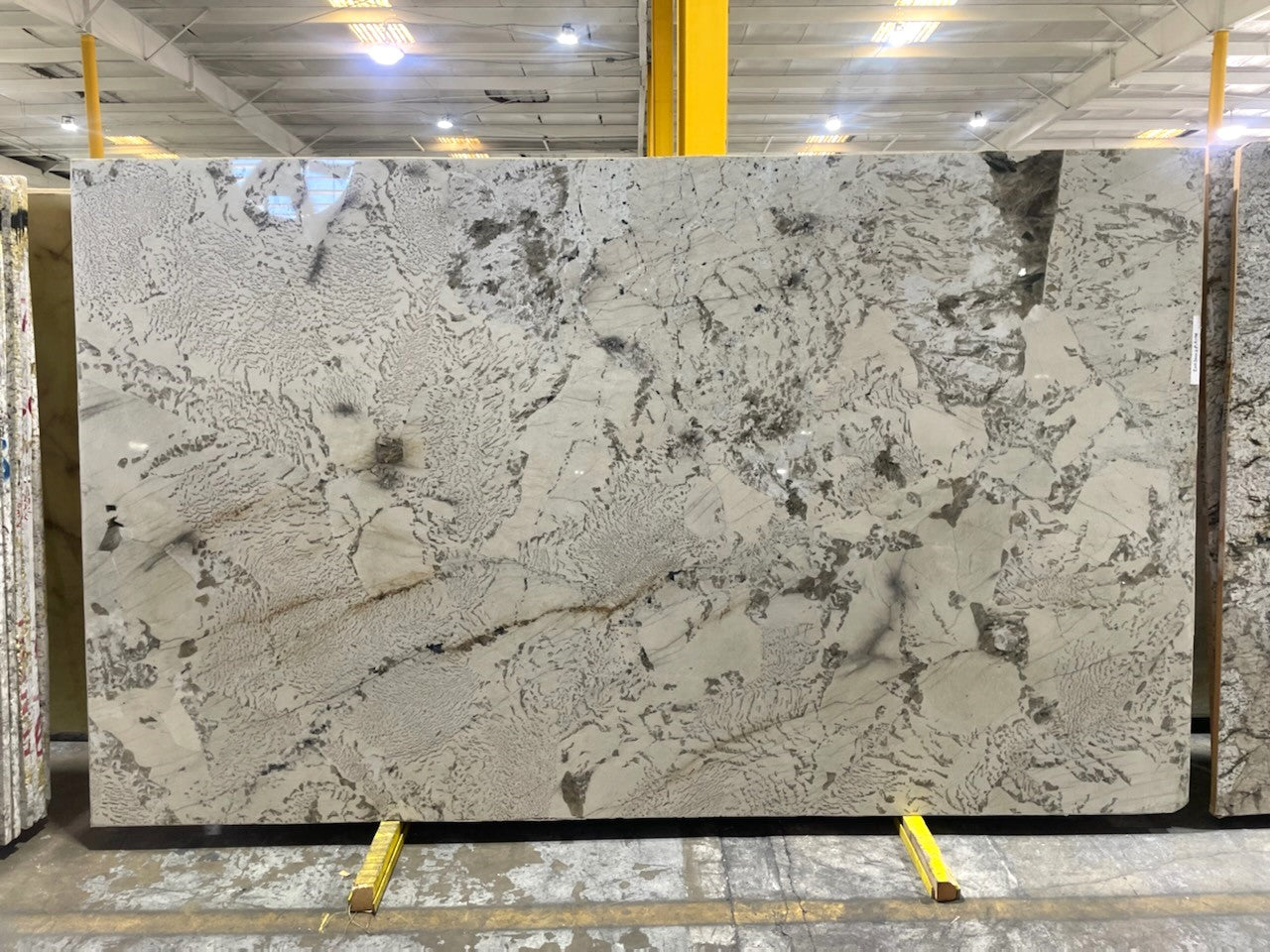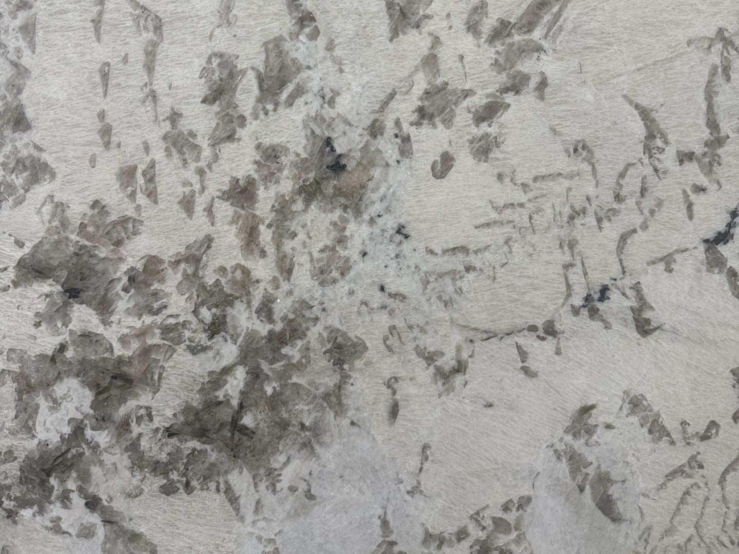 The veins can vary in thickness and distribution, creating a unique and dramatic look in Alpinus granite. It features a dark black background with intricate veins and patterns in white, gray, and other tones.