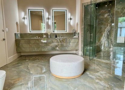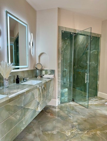 BM Onice Giada Slabs Porcelain is a high-quality surfacing material crafted to emulate the luxurious appearance of natural onyx stone. This porcelain slab showcases an exquisite blend of green and white tones, creating a captivating and elegant aesthetic.