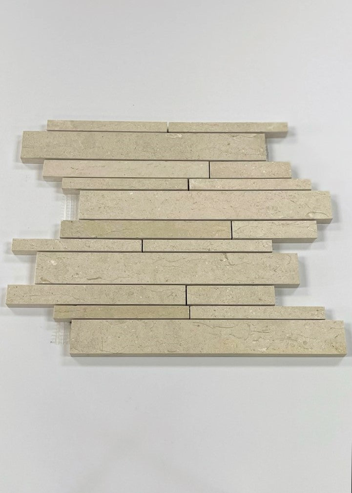 The classic marble, similar to Crema Marfil is displayed in a new light with this mosaic. With strips ranging in lengths and widths, this unique mosaic has the best effect when used in areas such as kitchen backsplashes in order too get the full feel of the marble mosaic. It also makes a unique shower floor when paired with a trench drain.