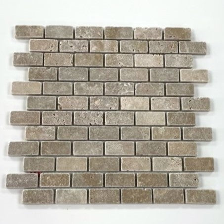 This milky browm travertine mosaic is cut and tumbled to small 1x2 rectangles. The brick layout has a greater impact when used in smaller areas, whether it be indoors or outdoors! The style of the warm tones and natural imperfections are sure to create a cozy, welcoming ambience to your home!