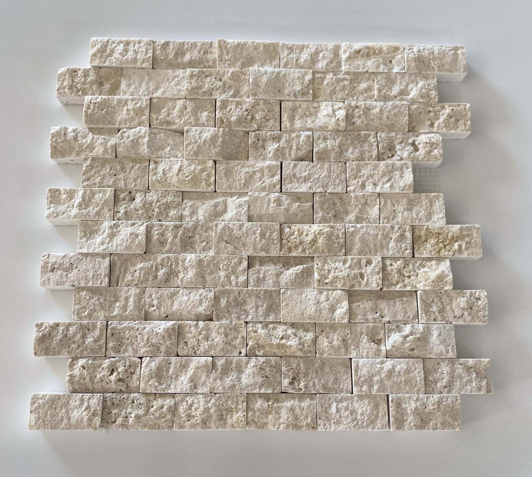 This mosaic consisting of our creamy light travertine cut in 1"x2" pieces assembled in an offset pattern instantly giving the room a sense of radiance. The split face finish adds dimension and texture to the area, giving it more of a rustic appearance. Earth Stone Colours notices this is the most popular travertine mosaic. The ivory travertine color and the unfilled travertine texture make it a favorite for interior walls and fireplace stone tile applications, plus outside for swimming pool accents and on raised walls that are best suited for a stone facade.