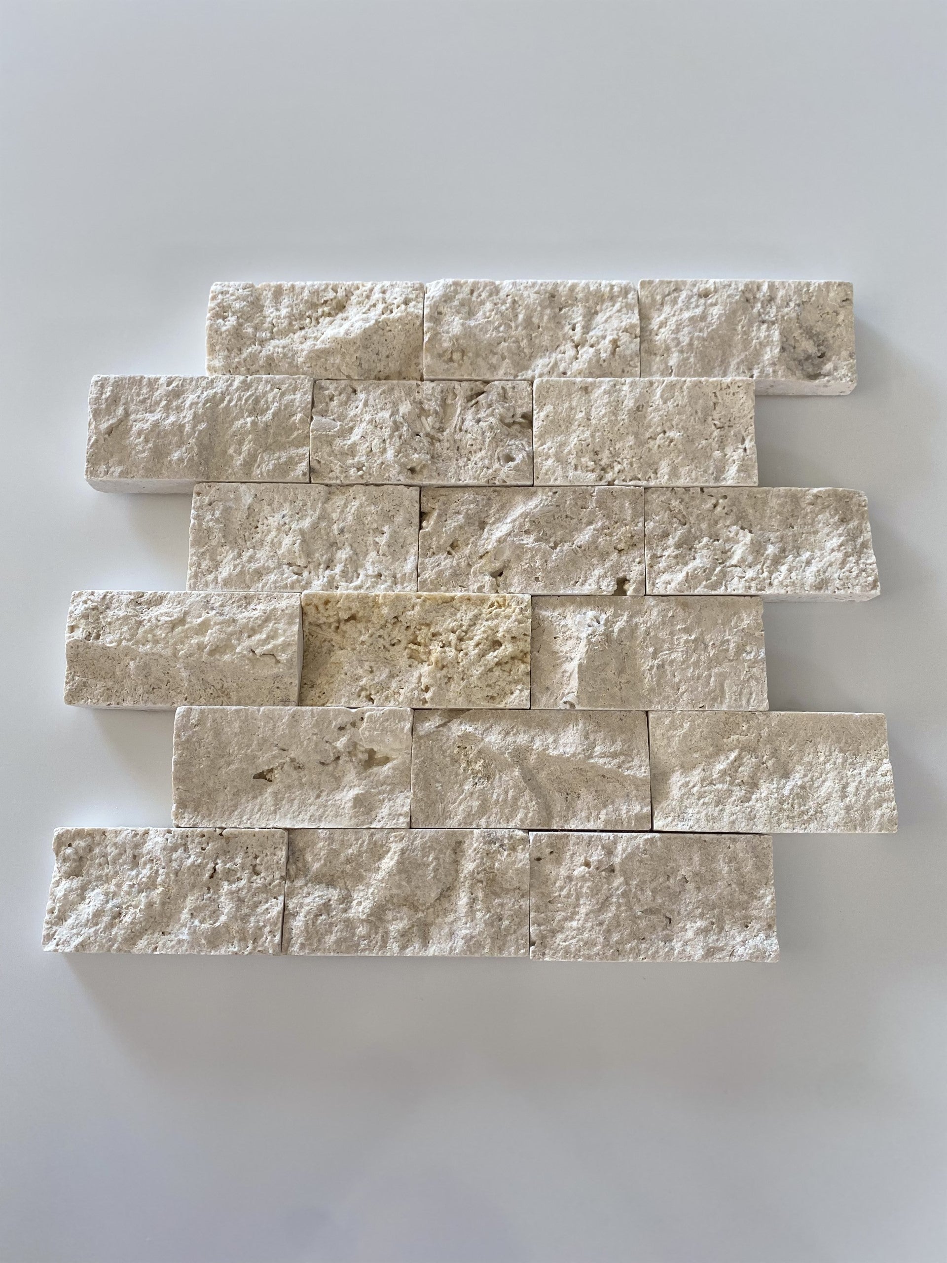 Whether its indoors or outdoors, this timeless mosaic we call Split Face Light travertine is sure to add a warm feel wherever its installed! This natural stone mosaic is made of 2"x4" pieces of ivory travertine offset on a mosaic sheet. The surface is called split face, meaning it has a rough chiseled type of finish that adds character. This travertine tile is unfilled and can be filled at the time of installation using grout or left in more of a natural state. The beige tones within this arrangement add a bright and cozy vibe, instantly amplifying the energy of the space.