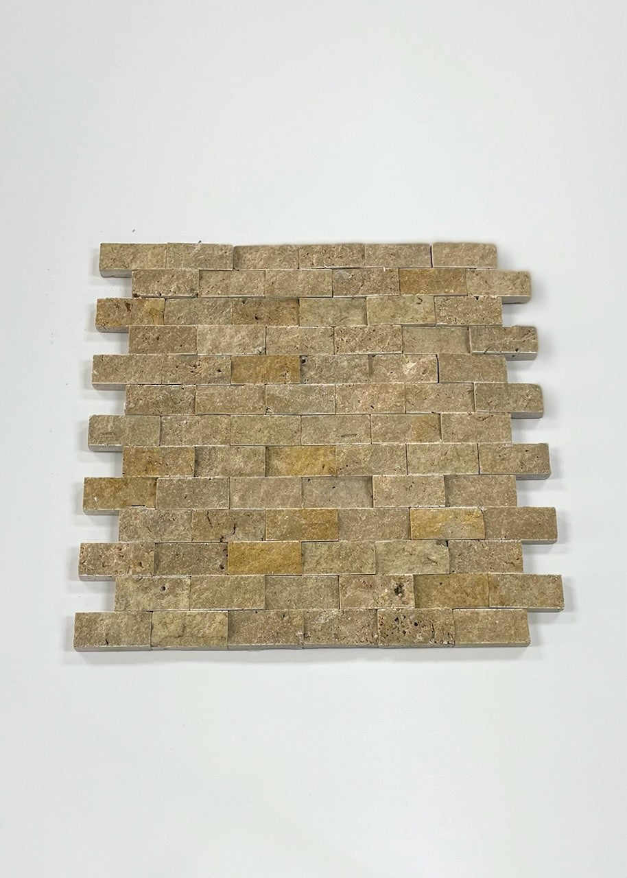 This mosaic consist of our noce travertine mosaic with a split face finish. The 1x2 strips are cut to a multi-levelled surface which adds a definite three-dimensional quality . This brings a unique characteristic to your indoor and outdoor living areas!