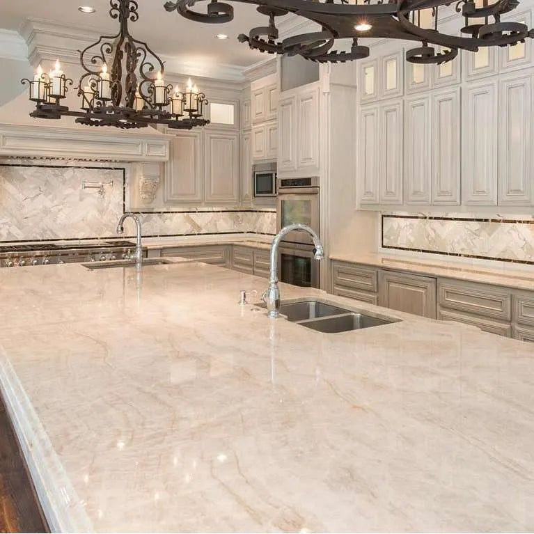 Taj Mahal stone is characterized by its creamy white or beige background with subtle veins and markings in varying shades of gray, gold, or brown. The overall appearance is often described as soft, sophisticated, and timeless, resembling the grandeur of the iconic Taj Mahal monument.
