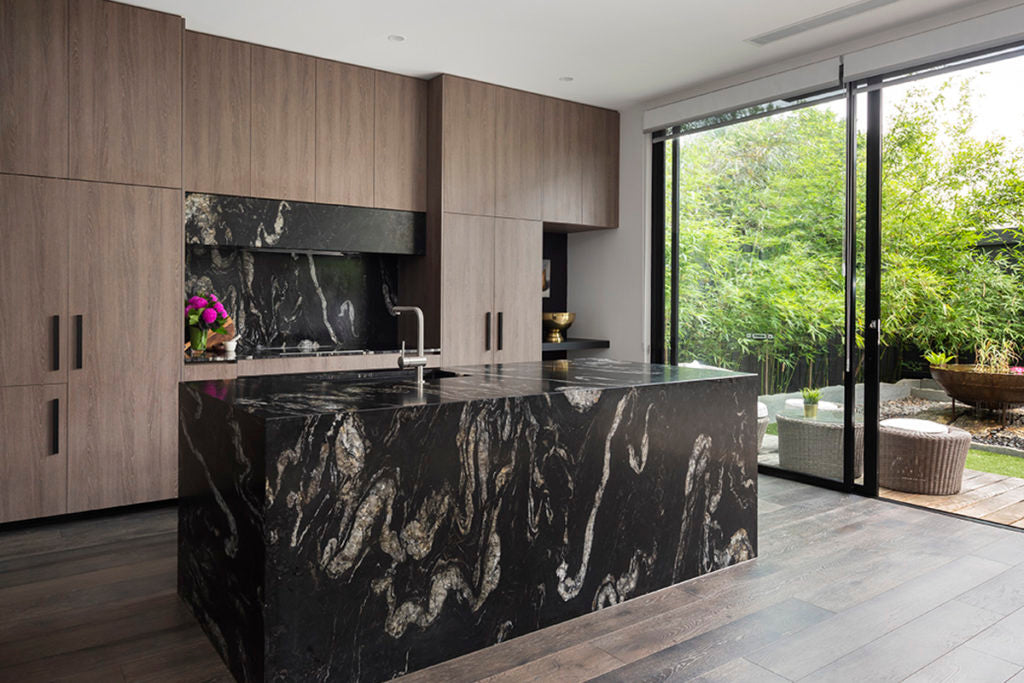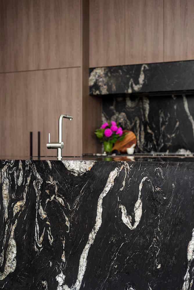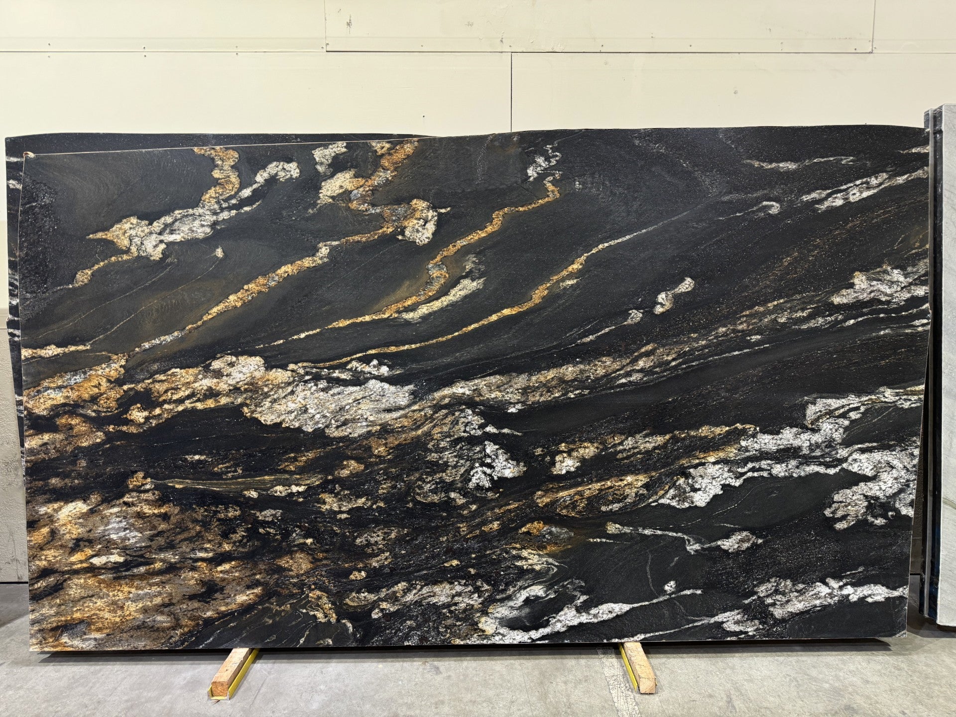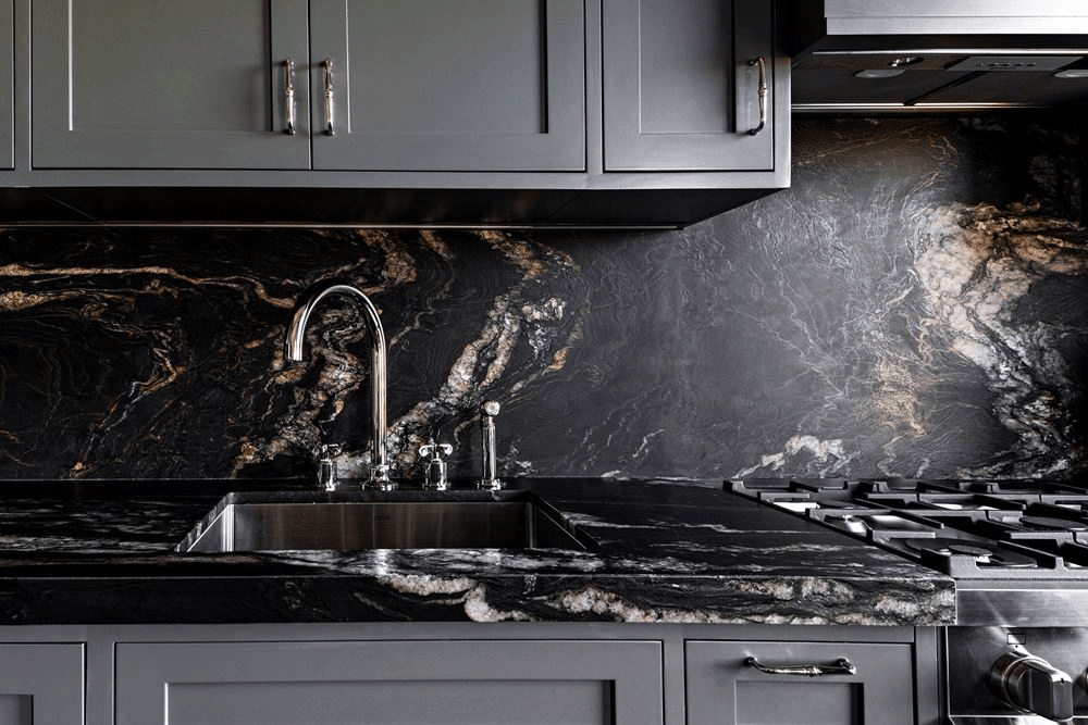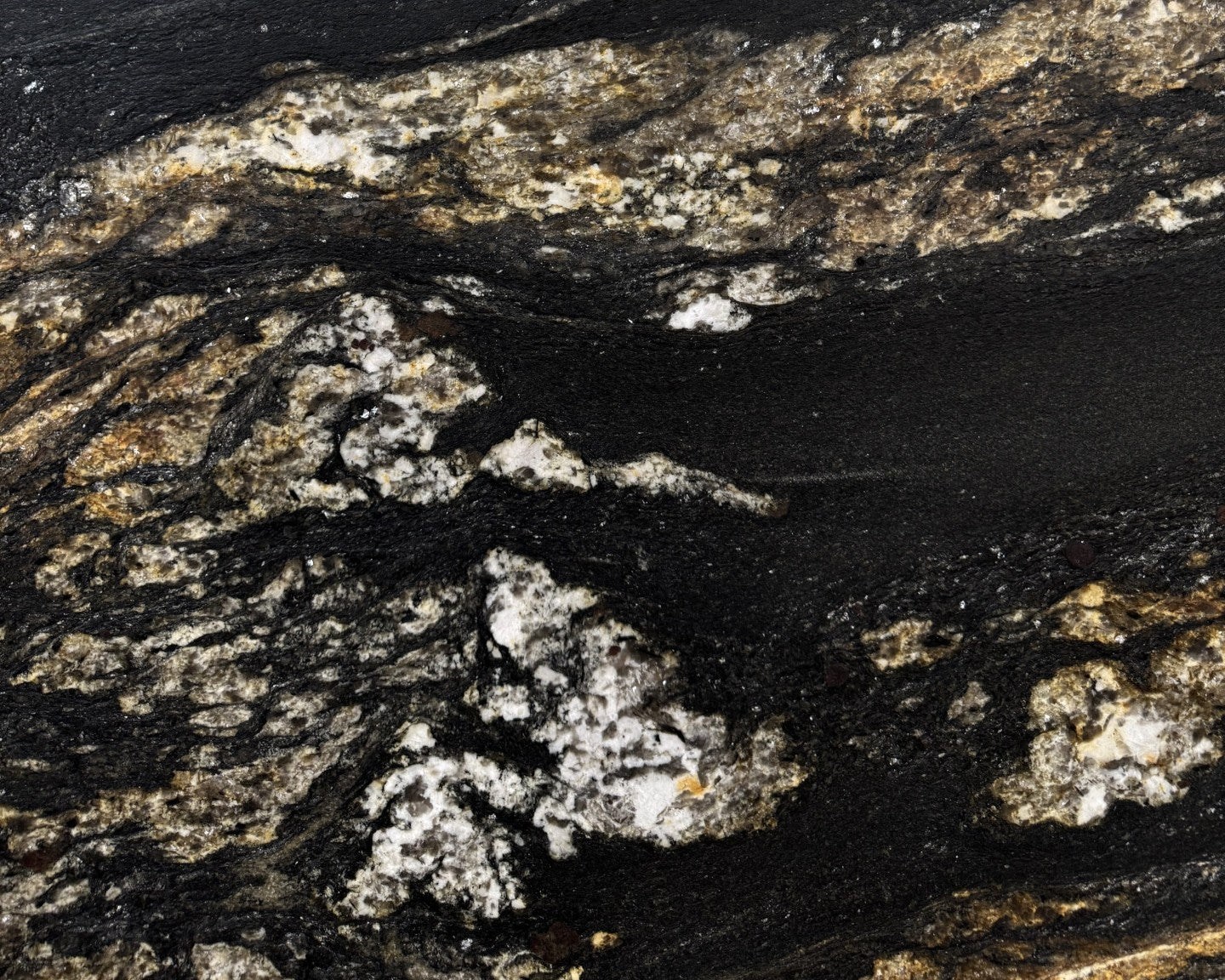 Titanium is filled with elegant movement of grays, blacks, golds, creams and even hues of burnt orange. This deep black stone has a beautiful wavy pattern and heavy crystallization. In addition to its beauty, Titanium granite is also very durable.