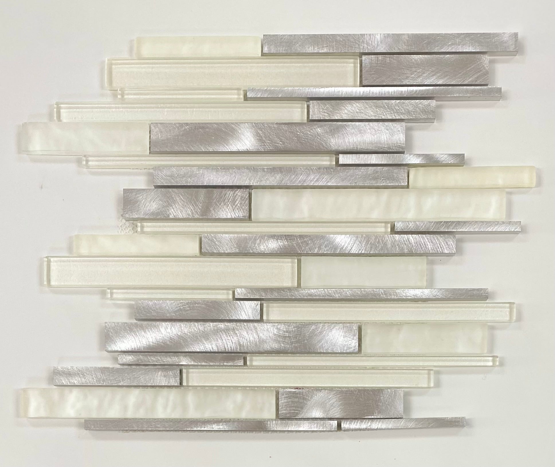 This mosaic is made up of ivory glass and stainless steel strips, both cut to different lengths and widths. The combination of the two materials make for a unique design, perfect for any upcoming kitchen or bathroom renovaion projects!