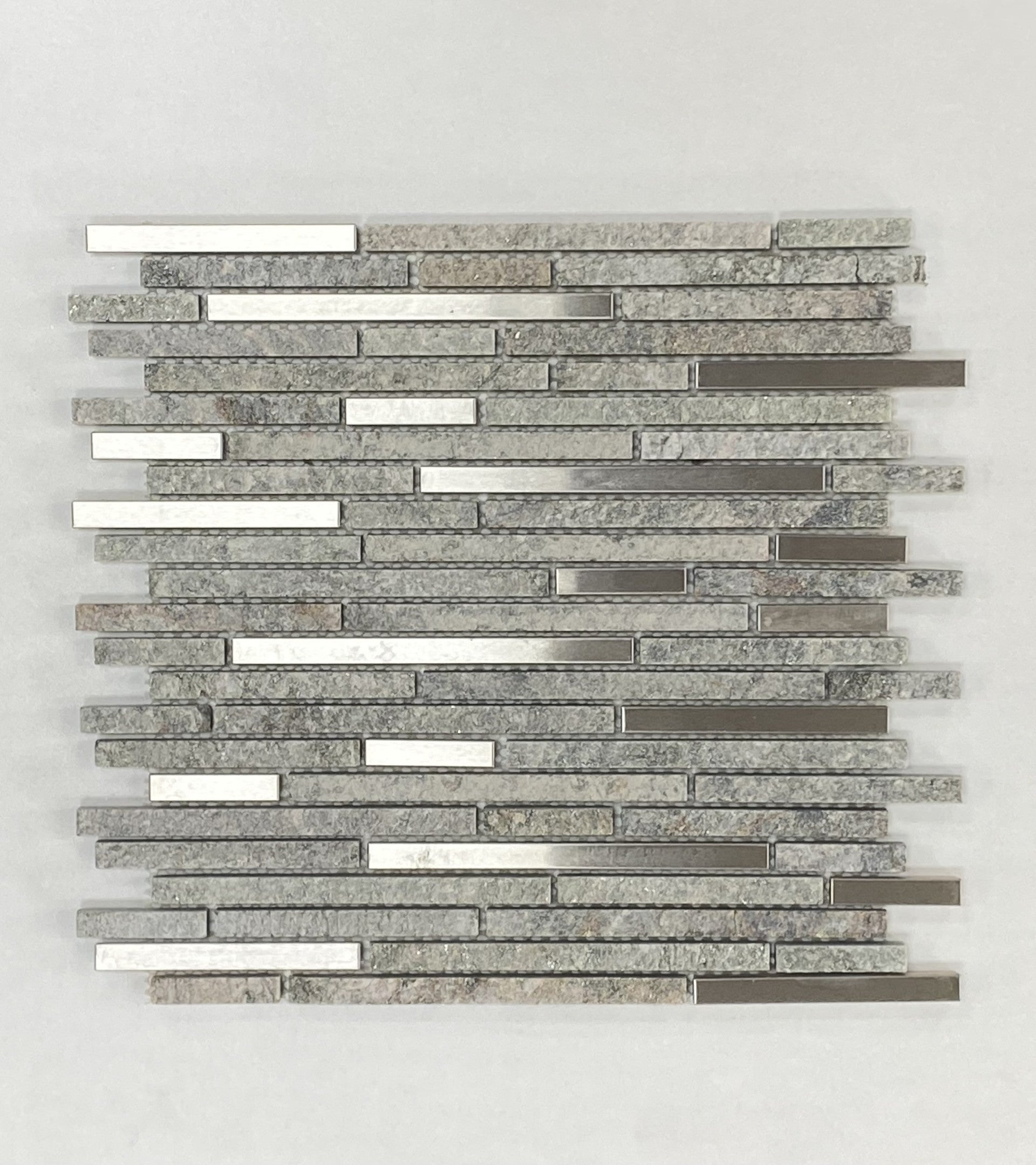 This mosaic is predomi tly made up of silver travertine strips with an occasional pop of metal sprawled throughout. The surface has a shimmery effect to it, making it all that more striking when accompanied by the shiny metallic recatangles. Select this as your outdoor kitchen accent.