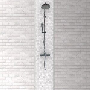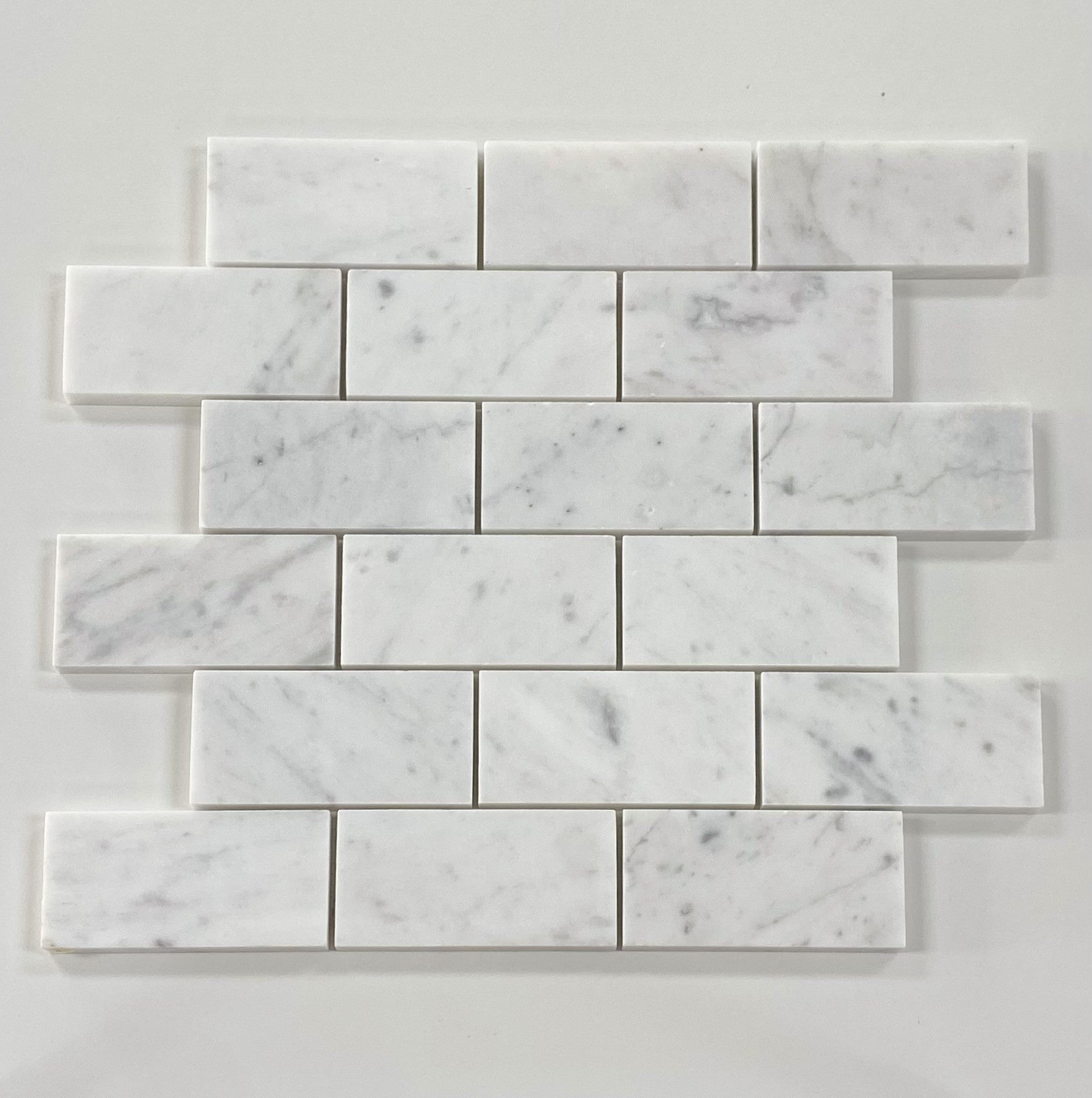 This white Carrara real marble mosaic is layed out in a classic brick-like pattern. Most often used for kitchen backsplashes and shower walls, the bright white background with specks of grey splashed throughout add a hint of elegance to the room.