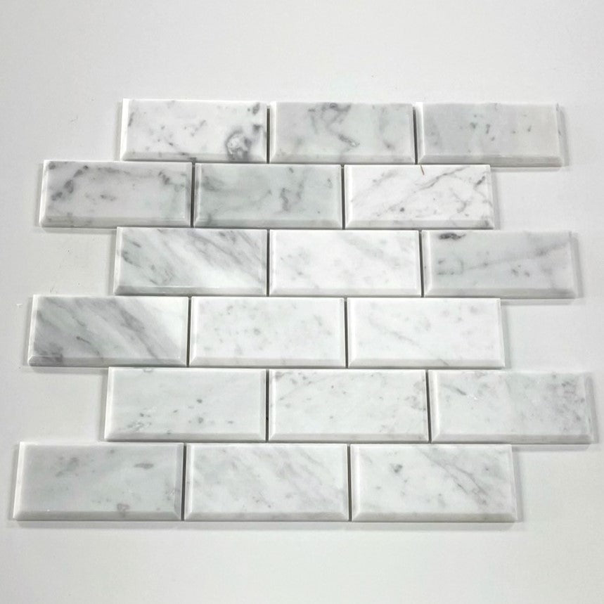 The classic beveled edges within this 2x4 marble mosaic adds a three dimensional characteristic to the area its installed in. Whether its your bathroom or kitchen backsplash, this mosaic is sure to leave a lavish impression with the cherished white Carrara marble and the glossy finish.